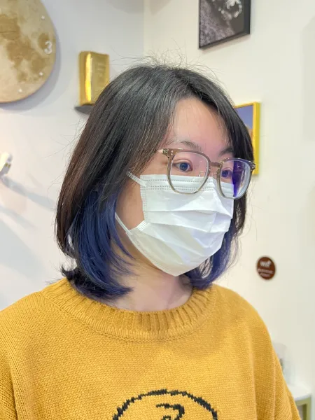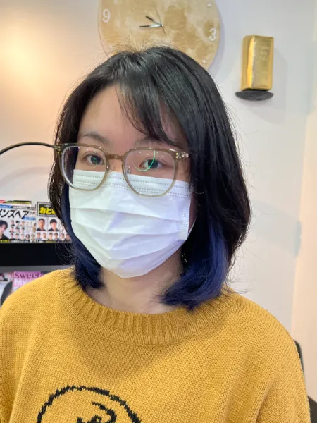 みうがカラーを担当して、インナーカラーにサファイアを入れました。カラー剤は日本製(ミルボン アデクシー)を使用しています。黒髪からの場合はブリーチ最低2回必要になります。カットは岩佐が担当しました。 ※インナーカラーは、表面の髪色はそのままに内側だけを染めるカラーで、ご希望に合わせて染める範囲や色をお選び頂けます。
